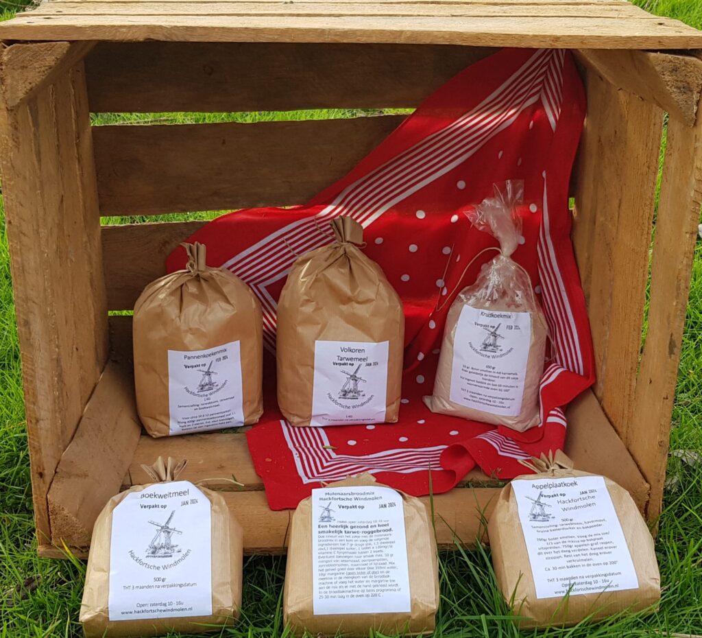 Volkoren tarwemeel, boekweitmeel, pannenkoekenmix, kruidkoekmix, appelplaatkoek en een mix voor tarwe-roggebrood.