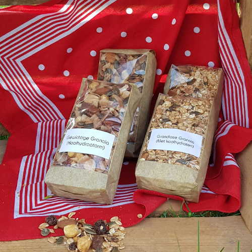 Voor een heerlijk voedzaam en gezond ontbijt kunt u ook bij ons terecht. In samenwerking met Kokkie Anoukie Catering hebben wij ons assortiment aangevuld met overheerlijke granola. In ons assortiment vindt u een koolhydraatarme granola en een granola met koolhydraten. Granola kan door de yoghurt, melk (bekijk ons assortiment aan zuivel) of vers fruit.